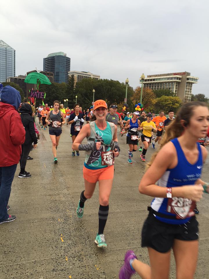 I could feel that I was slowing down a bit over the bridge, but didn’t let it get to me and knew that my teammates had a cowbell corner set up just over the bridge before entering Crystal City around mile 22. Boy did it feel good to see them. Fellow bird Taylor snapped these awesome shots below capturing my excitement (and other birds) at seeing them along the course. This gave me a nice boost through the next mile as did the crowds lining the streets in Crystal City.
