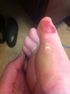 Instead I did a just more than 6.5 mile tempo run at an average 7:30 pace. I could feel the blisters forming and I almost never get blisters. I should have stopped. I kept telling myself I was just being a baby and looking for an excuse to get out of my tempo run. Somehow I made it the whole way, but boy did it make for an uncomfortable walk home. I had multiple blisters on both feet and the biggest blood blister I’ve ever seen on my big toe. Ouch!
