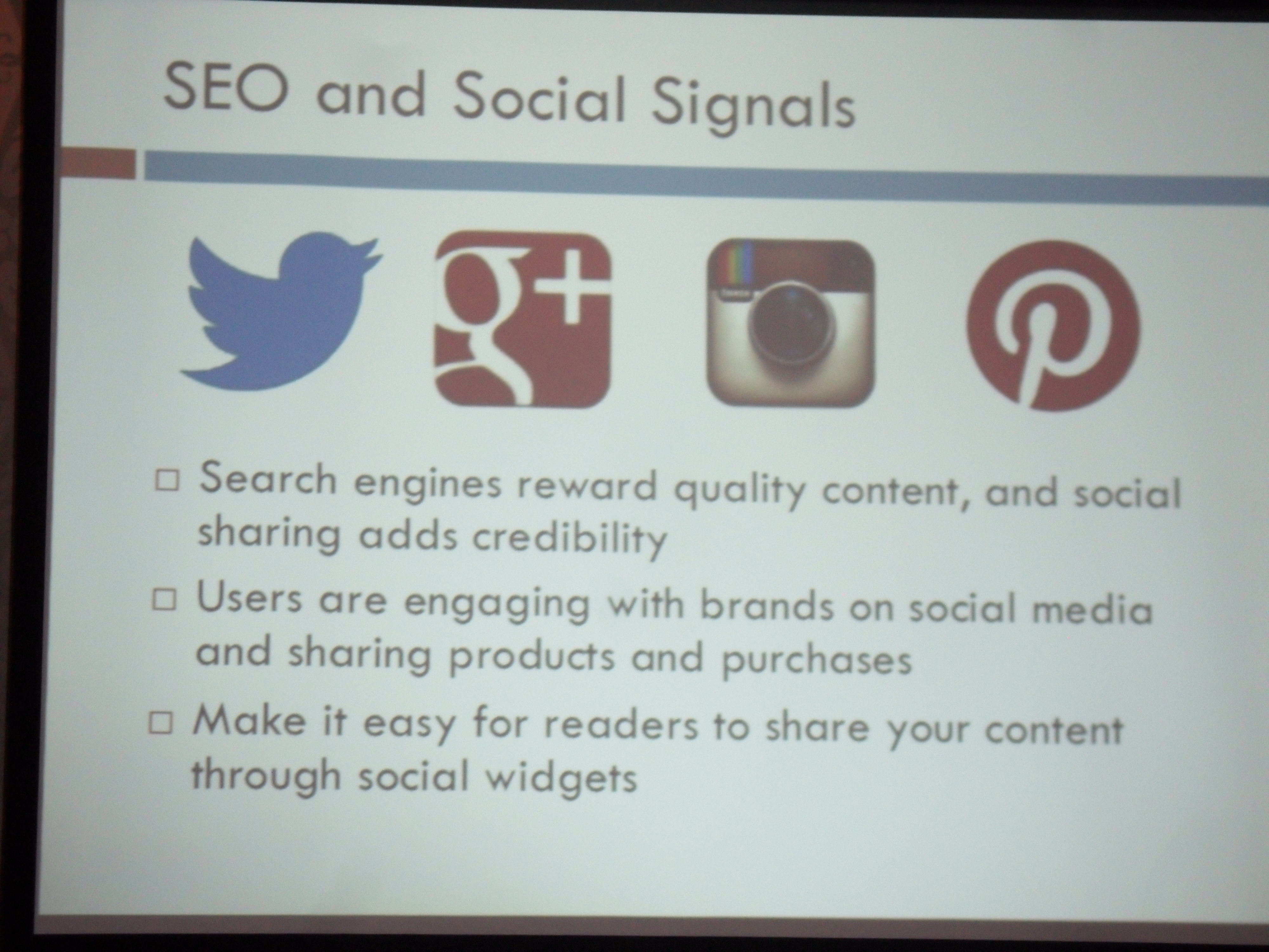 I went to another session on Google Analytics: Moving Beyond Pageviews that proved to be extremely helpful. You can check out the presentation here. I thought I had a good idea about how Google Analytics worked, but quickly realized I have a lot to learn. The Search Engine Optimization (or SEO) session, Building Your Blog Through Organic SEO, Social Signals and Image Optimization, was equally helpful. We learned about Google’s Panda and Penguin updates that have really changed how SEO works and are starting to make quality of content more important to your Google ranking. I also learned that I need to stop neglecting Google+ (not surprisingly) if I want to create the biggest impact possible.
